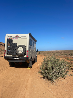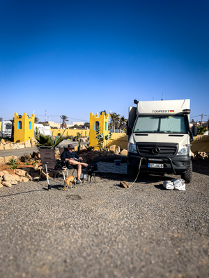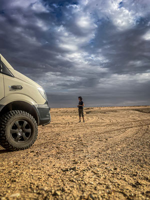 Erstens, auch wenn wir oder speziell ich, ein absoluter Pistenfan bin, glaube ich das es in Mauretanien doch zuviel des Guten ist , besonders aber auch für unsere beiden Fellnasen. Die sind zwar eigentlich äusserst entspannt wenns rumpelig wird, dennoch wollen wir sie auch nicht zu sehr quälen. Apropos quälen, dasselbe gilt auch für unser rollendes zu Hause, denn auch wenn die Kiste ne Menge drauf hat, ist es doch immer wieder aufregend, besonders für mich, wenn wir den Sprinter im Grenzbereich bewegen und ehrlich, ich möchte das nicht überstrapazieren, denn wir müssen das ja nicht. Ganz anders sähe das aus, wenn es keinen anderen Weg gäbe, aber solange wir entscheiden können, werden wir diesbezüglich doch immer den Weg des geringsten Wiederstandes gehen. Wir sind keine Offroader sondern Reisende die gerne die befestigten Wege verlassen und das können wir hier in Marokko zur Genüge . Abgesehen davon habe besonders ichnatürlich einen gehörigen Respekt davor mich und meine Familie in Gebiete zu fahren wo sprichwörtlich nichts ist, dieses Maß an Verantwortung ist mir zu diesem Zeitpunkt einfach ne Nummer zu Groß .