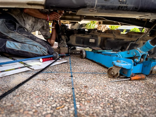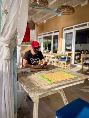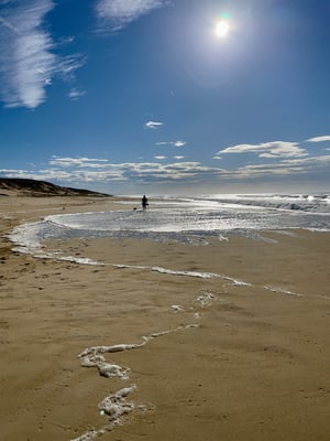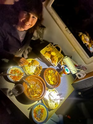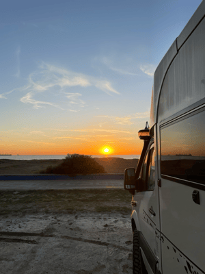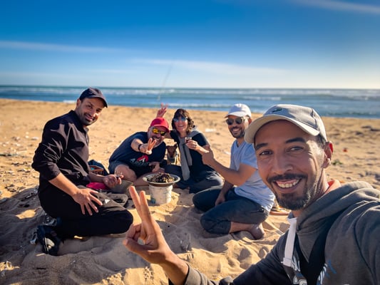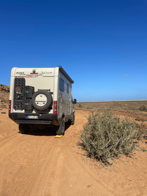 "What a fantastic day with a downside. After driving the rather boring 300 km from Dakhla, we found this beautiful spot right on the beach, which, as we later learned, is considered forbidden because human traffickers are apparently active there. We weren't alone; two other campers were within sight, and the police were supposed to come later for passport checks. Oh well. We had a wonderful day at the beach, and after two Moroccans asked me to lend them tools to free a car stuck in the sand, I didn't hesitate to grab the sand ladders and shovel and head to the scene of the mishap. After a bit of digging—by now there were six of us—it turned out that the actual driver wasn't one of the guys who had asked for my help. Once the ladders were buried under the front wheels, we could get going. Unfortunately, the driver didn't seem to care about giving it a good amount of gas or using the clutch gently and tried to get going at idle." Getting the car out of the deep sand. On the second attempt, I asked for access to his cockpit, and with increased revs and plenty of throttle, I hammered his Honda out of the sand, with lots of verbal support from the team 😜😜... The car was free, and we'd earned an invitation to the most delicious tagine, which the guys on the beach (they were fishermen) had prepared. This uncompromising hospitality and this fantastic moment eating delicious traditional food with our hands there—it couldn't have been better. We had great conversations (which went really well in English), and we're actually invited to visit Ali and his family in Boujdour tomorrow. But unfortunately, Mellie strikes again... After she tore off a claw on her hind paw three days ago, and we've managed to keep it from getting infected so far, the day ended with another claw loss, this time on her front paw. It seems to be the grooves on our step that she can't handle during her kamikaze jumps. So, no meeting Ali's family, and off to our trusted vet, who, according to our research, is almost 180 km away in Laayoune 🤦♂️😔… now we can carry our girl around 😜… in and out for walks… Still, a great day… Conclusion? We're all the same, even if religion, culture, or politics sometimes try to tell us otherwise."